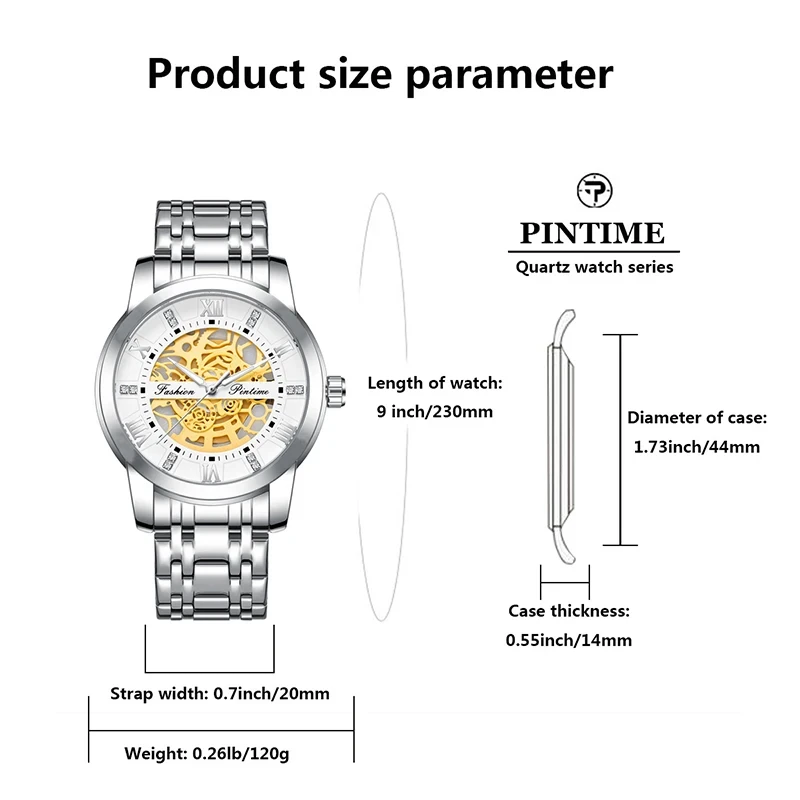 "The PINTIME watch redefines style with its modern and elegant design. Its numberless dial and silicone strap offer a clean and sophisticated look, while its durable alloy case and quartz movement guarantee precision. Ideal for those looking to stand out with a unique and timeless accessory. Make it yours and make a difference!"