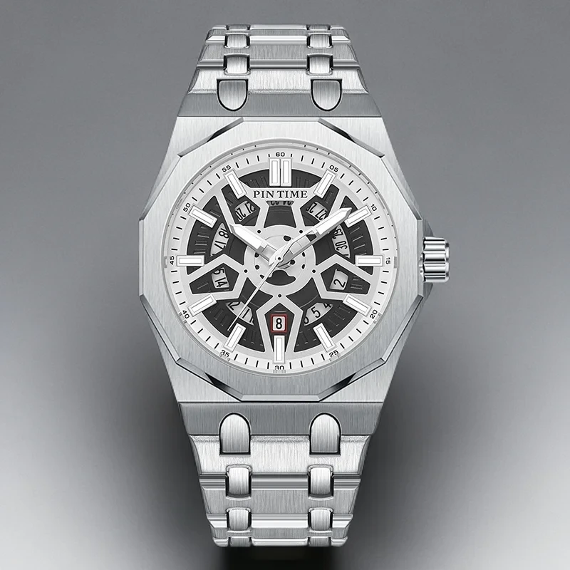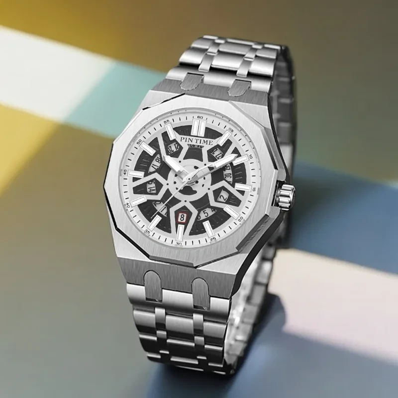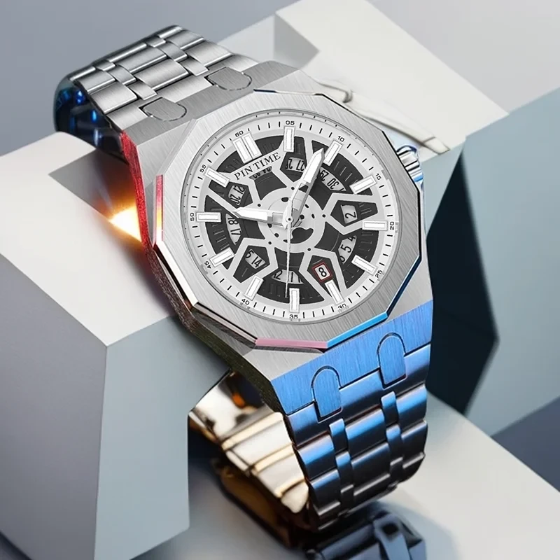"Luxury and precision meet in the PINTIME watch. With a 45mm dial, water resistance up to 3 ATM and elegant Roman numerals, this stainless steel watch is the perfect accessory for those looking to stand out with style and sophistication. Take time to another level!"