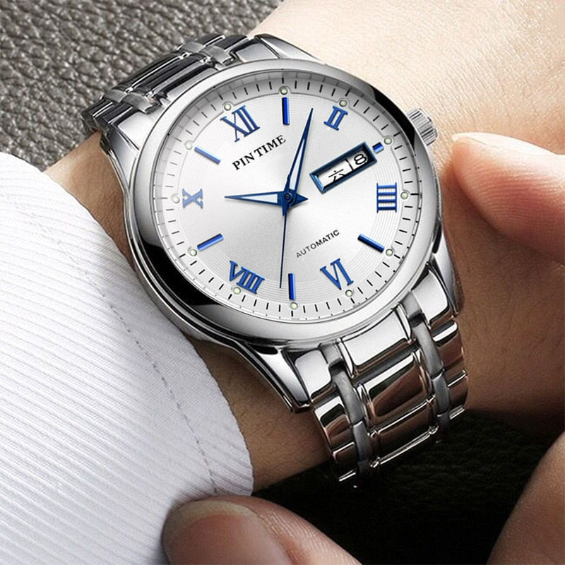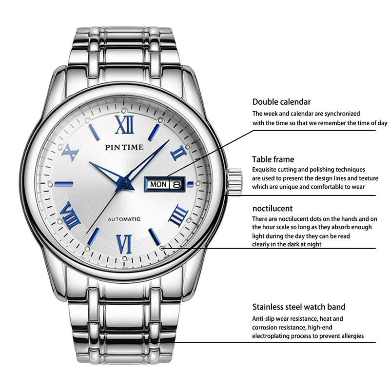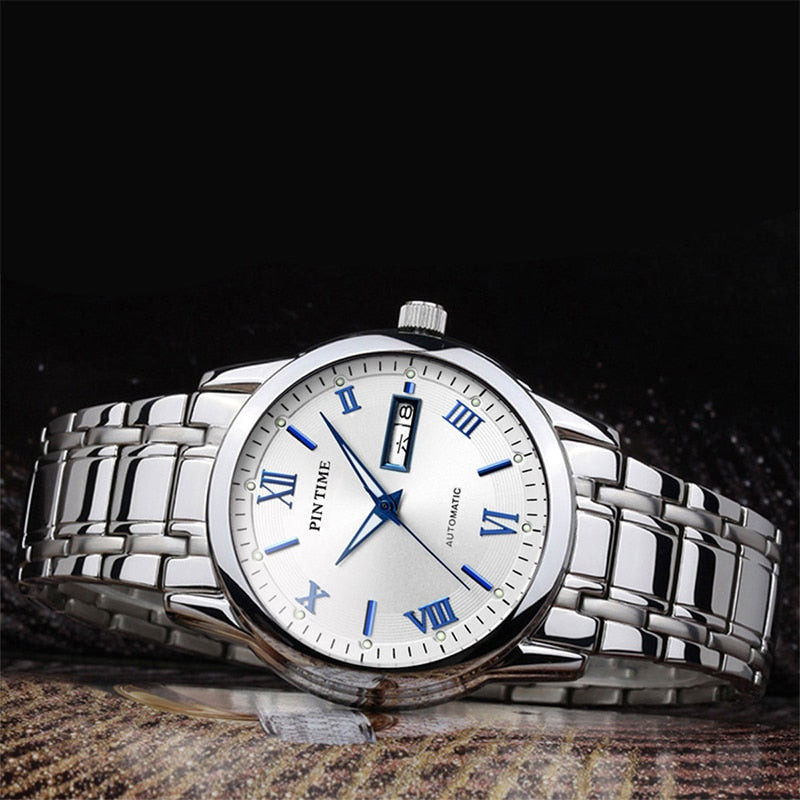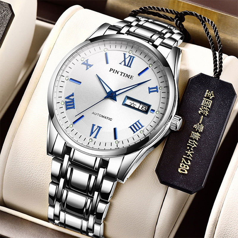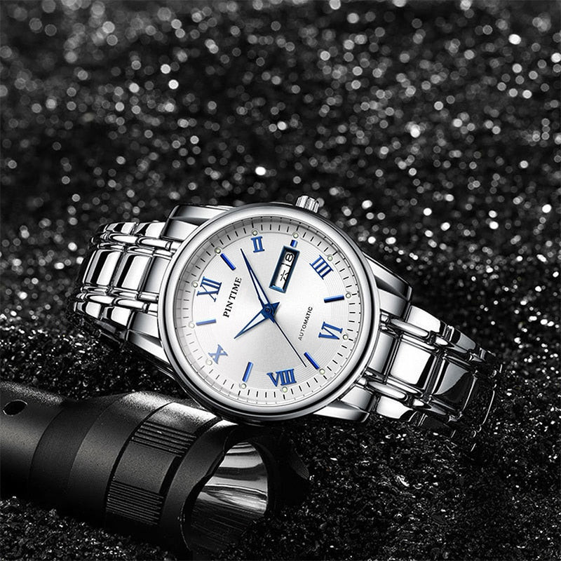 The PINTIME 23628 men's automatic watch is a stylish and casual timepiece that is perfect for any occasion. It features a stainless steel case and a stainless steel strap, making it both durable and comfortable to wear. The watch is also water resistant to 3 bar, so you can wear it in light rain or splashes.