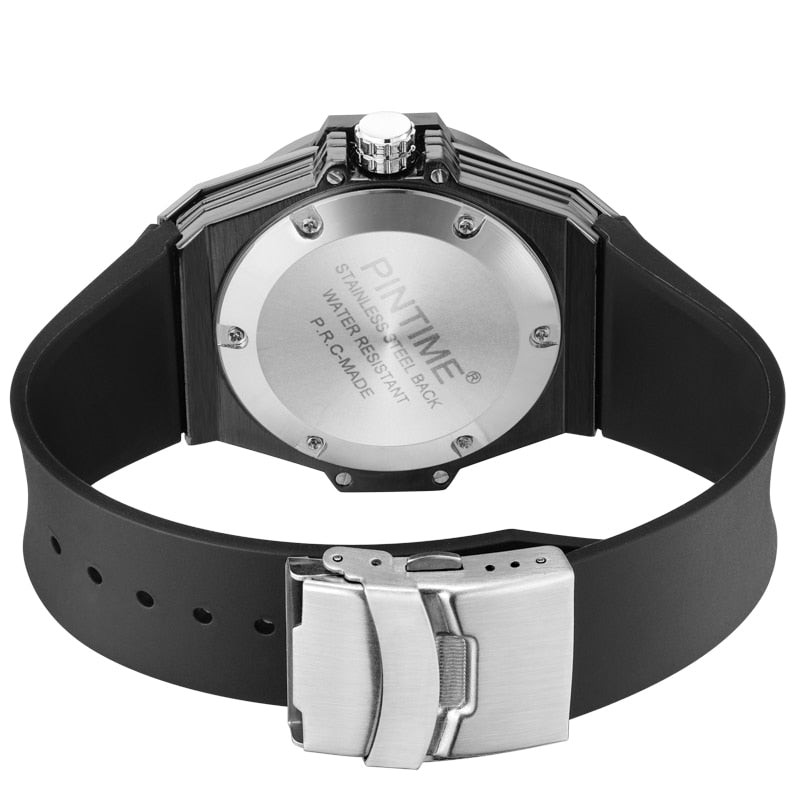 This is a fashionable men's sport watch by PINTIME, model number 8118. It is a luxury quartz wristwatch with a water resistance depth of 3Bar. The watch has a casual style and is suitable for daily wear. The dial window is made of Hardlex and has a diameter of 44mm. The case thickness is 18mm and has a round shape, with the case being made of rubber. The band width is 22mm and the band is made of stainless steel, with a length of 26cm. The watch features sport functions and is water-resistant. It has a folding clasp with safety and is designed for men.