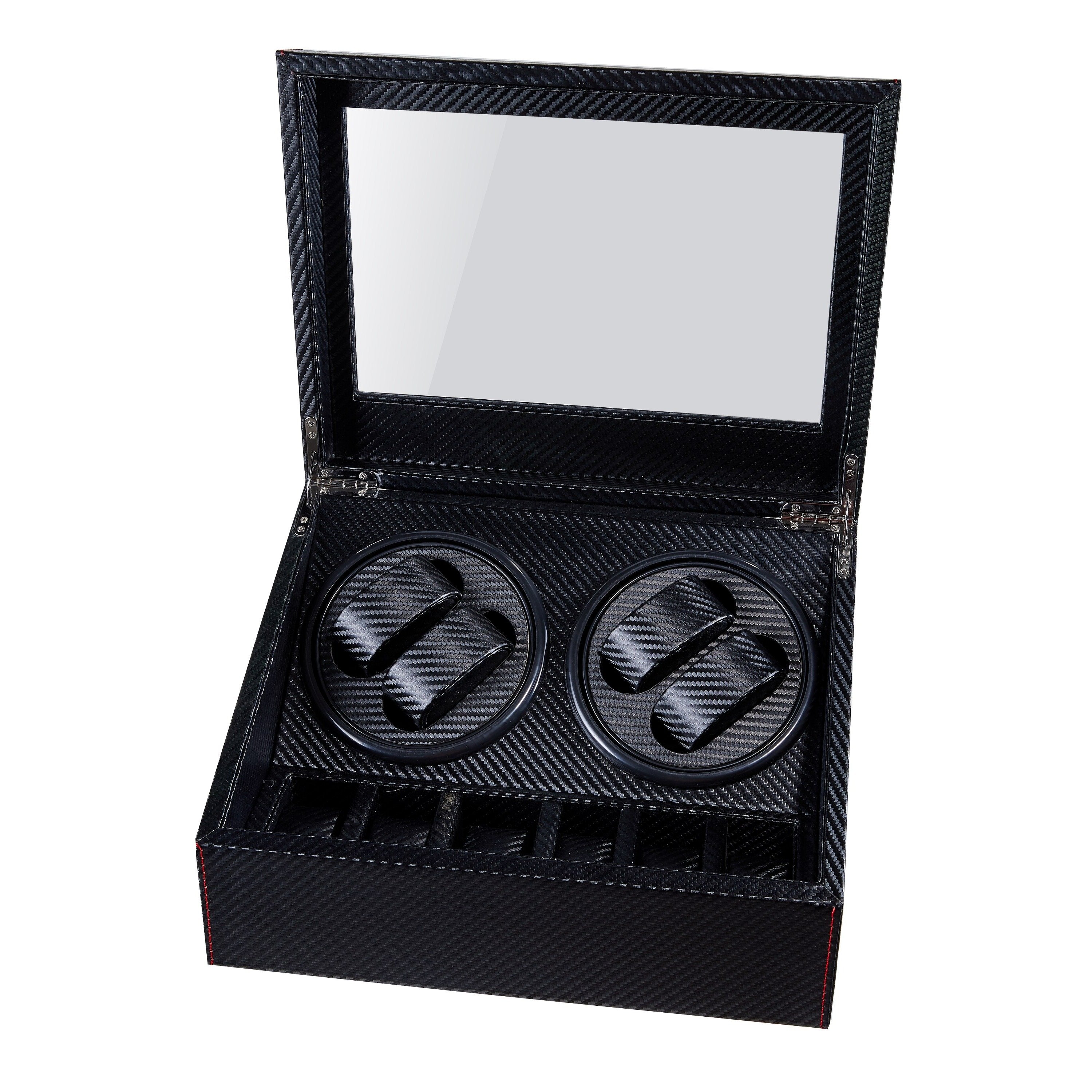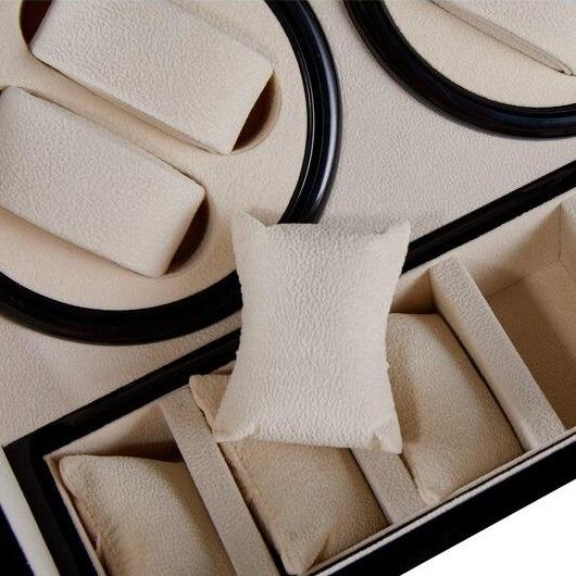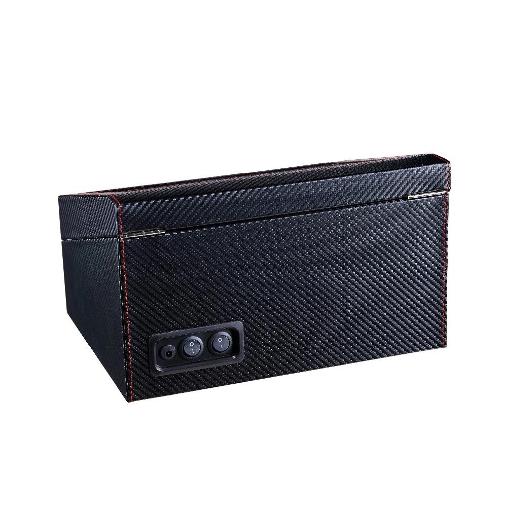 The Antonio Watch Winding Storage Display Box 4+6 is a timeless, aesthetically pleasing addition to any collection. The minimalist design will complement your home while its functional features ensure that you can enjoy wearing your favourite watches without the worry of timekeeping errors. This clock winder comes in many material options including carbon fibre or wood exterior and features the softest leather or suede interior to keep your watches safe and free from scratches. It has a Japanese movement, and a low noise system which makes it convenient in use while this elegant winding storage includes four different winding modes - clockwise, counterclockwise and both directions provide enough power when needed so all of your favourite timepieces work at optimal levels.