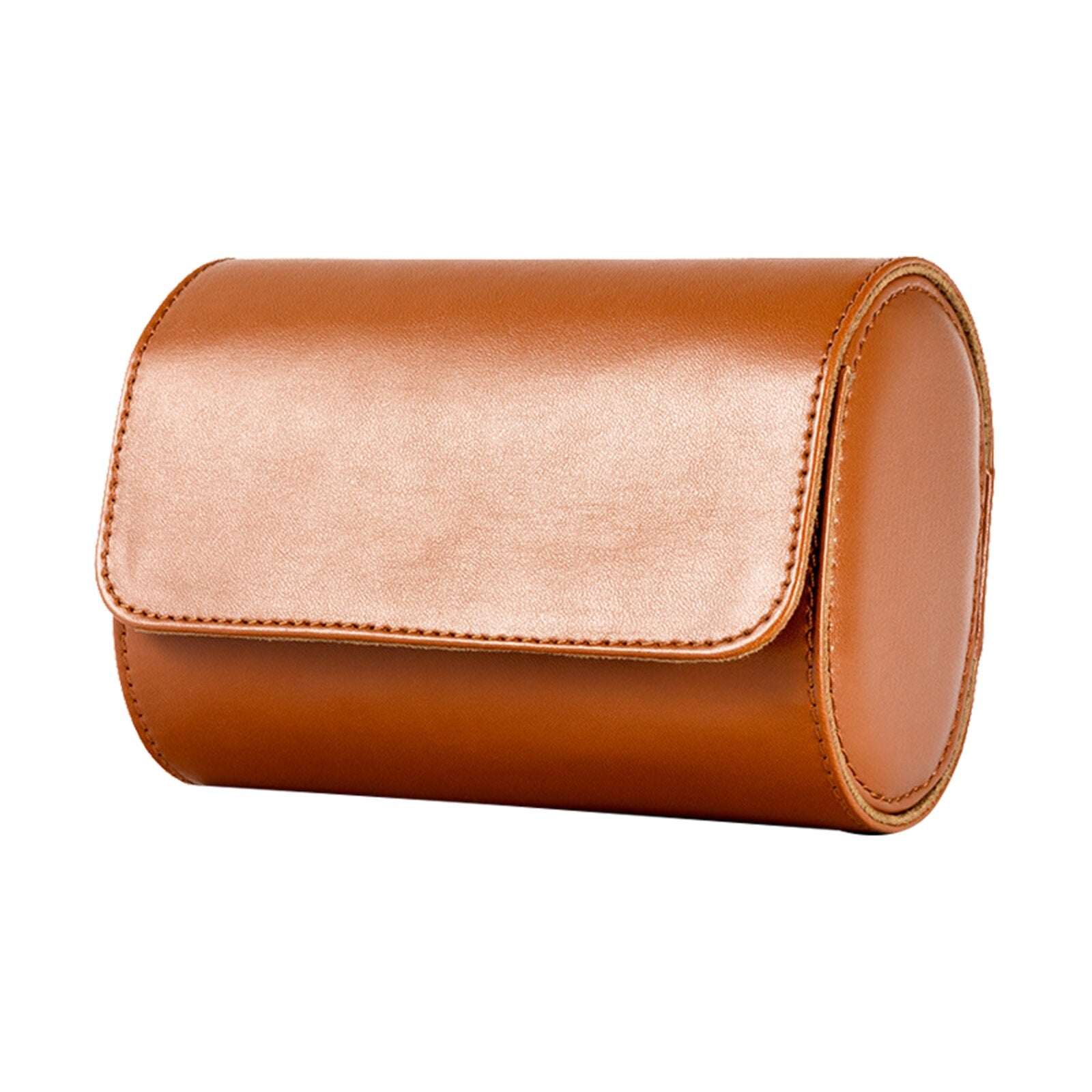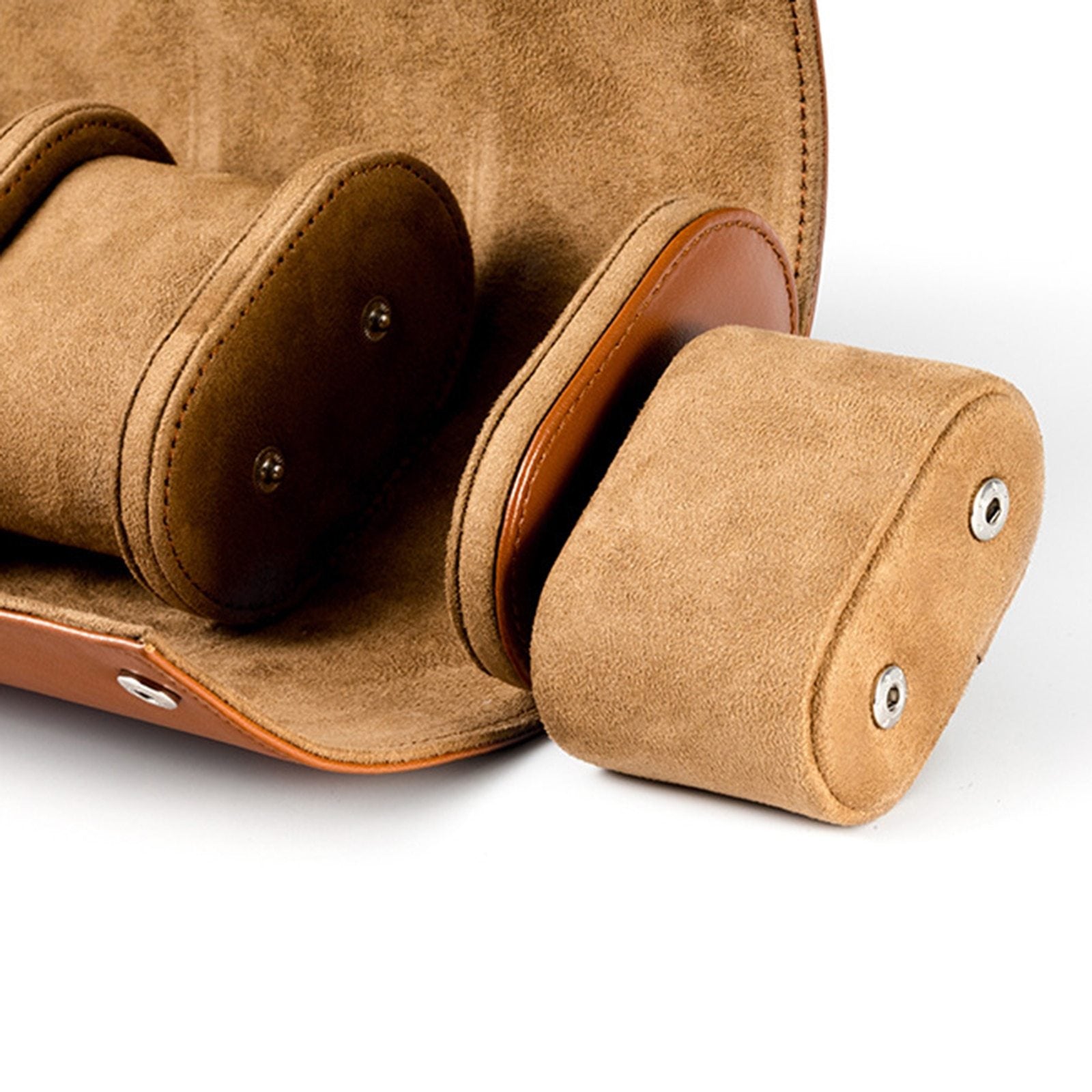 The Mathis Leather Travel Watch Roll Case 1-3 Slots is a great way to protect your priceless watches while on the go. A light brown vegan leather exterior incorporates a classic gentleman’s travel necessity with a bit of flair. This elegant travel watch roll with delicate suede pillows, brown lining and snap closure is available for one, two or three timepieces.