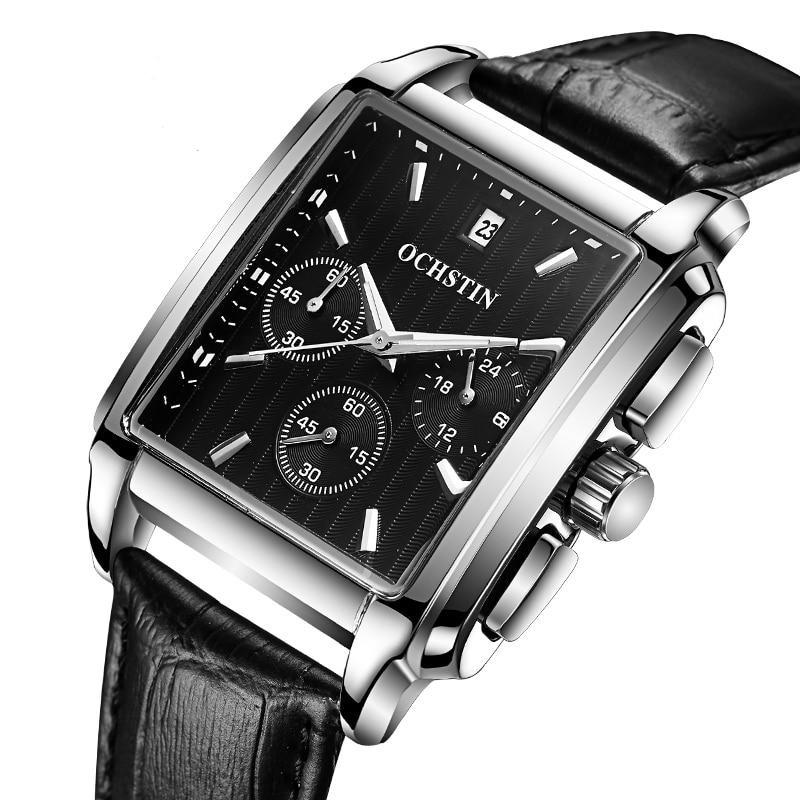 This watch's colour scheme blends the best of french elegance with timekeeping accuracy provided by the Japanese quartz movement. The black dial features easy-to-read markers, numerals, a date window, and 3 subdials that are easily accessed by the side buttons at two and four. The 4th subdial marks the day… so you’ll never miss the weekend. Textured black leather straps wear well over time and are easily interchangeable with quick-release pins.